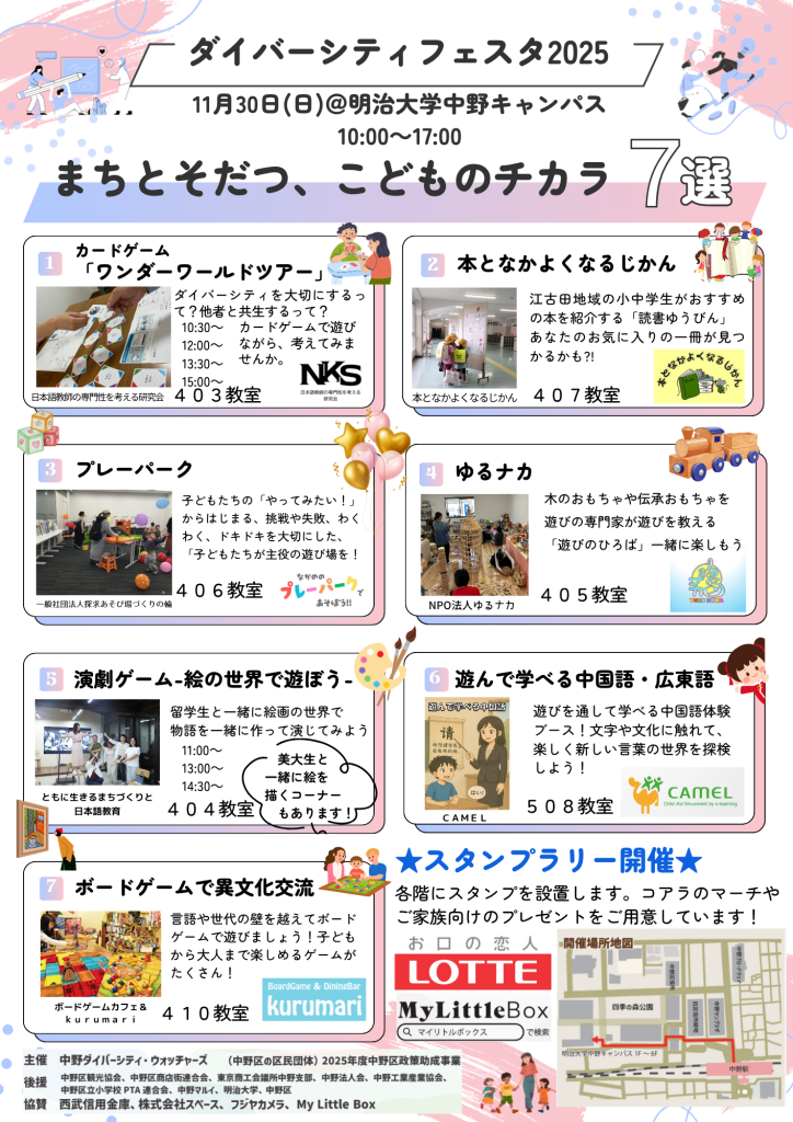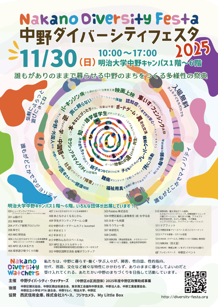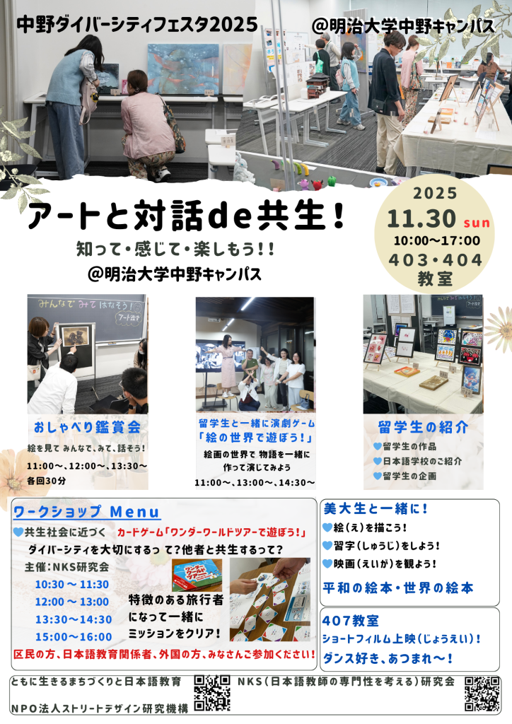 2025年11月30日(日)@明治大学中野キャンパス で、ダイバーシティフェスタ2025を開催します。ともに生きるまちづくりと日本語教育では、「アートと対話de共生」をテーマに、アート作品展、カードゲームで共生、絵画の世界で演劇体験、おしゃべり鑑賞会(芸術鑑賞)、日本語学校紹介、平和の絵本世界の絵本、習字、美大生と絵を描こう、ダンスで集まれ!など、さまざまな企画を計画しています。ぜひぜひ、ご参加ください。